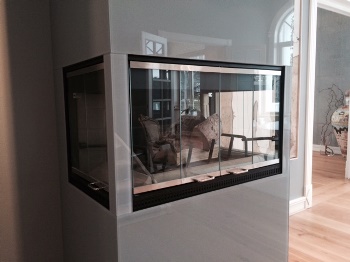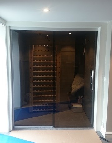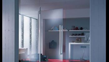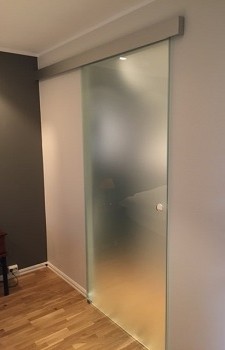 Skyvedør i frostet herdet sikkerhetsglass montert med skinne i topp